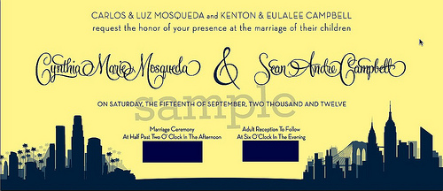 Sean’s friend and former co-worker, Noma, agreed to design our invites last fall. A couple weeks ago, she sent us ten (!) different options — she said she got a little carried away. The various invitations differed in printing costs and how they incorporated our colors and other ideas. Although we don’t have a particular theme, we wanted the invitations to reflect the bicoastal and long distance origins of our relationship. We sent her these cards from Etsy for some inspiration: a tale of two cities and you and me city skyline. Dennis got married to his girlfriend, Sherisa, in 2010; their invitation was an inspiration as well.