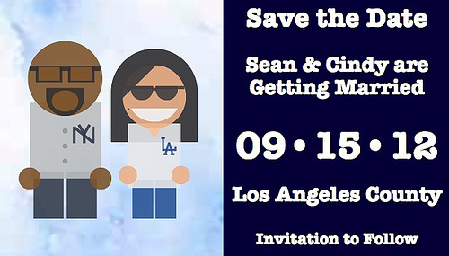 Sean and I haven’t been trying to make our wedding aesthetics “us” since that’ll be taken care of based on the fact that we’ll be the ones at the altar. How much more “us” can it be? I understand reflecting taste, personality and relationship history in weddings, but it seems like a lot of extra work. The invites and save the dates, however, were areas where wee knew we could express our personalities and relationship without trying too hard. I’m grateful we have friends like Noma and Dennis who are willing to use their time and talent to help us achieve that goal.