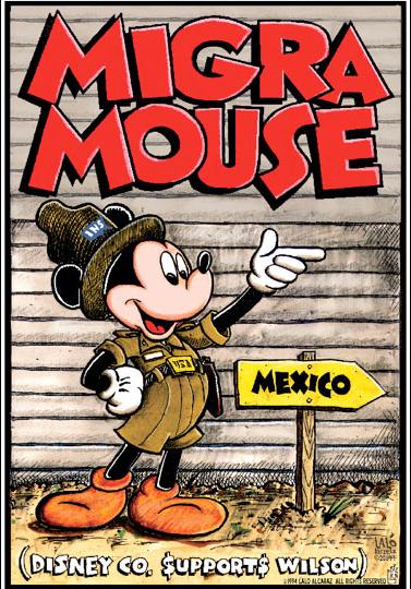 “Migra Mouse represents the corporate interest of the Walt Disney company, which donated money to then California Governor Pete Wilson’s re-election campaign. Wilson was exploiting the illegal immigration issue in the most divisive way, so I felt it was necessary to point out that wholesome Disney was affiliating itself with Wislon and Proposition 187, a xenophobic state ballot.”