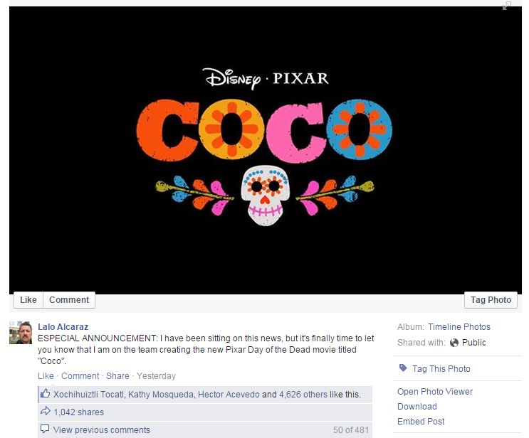 Sunday morning political cartoonist Lalo Alcaraz joyfully announced via Facebook that he was working on the new Disney Pixar Day of the Dead-themed animated film, Coco.